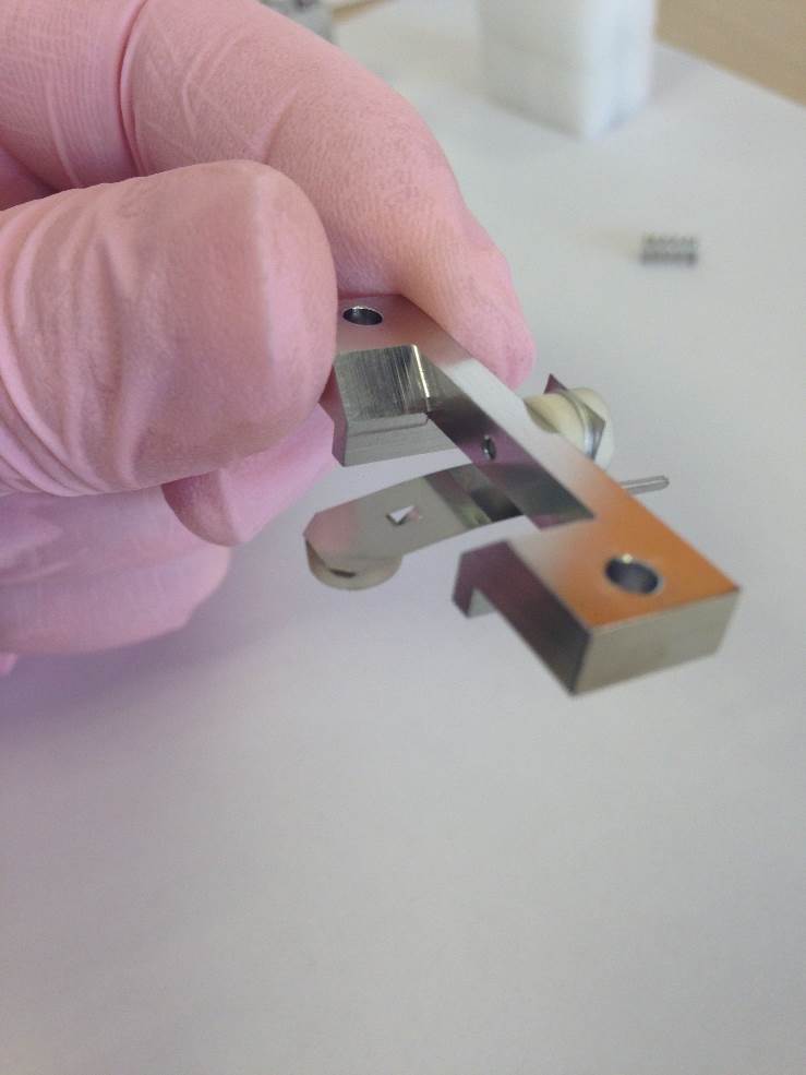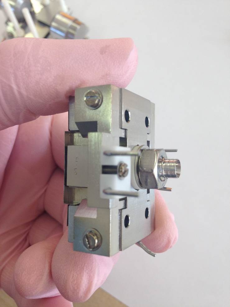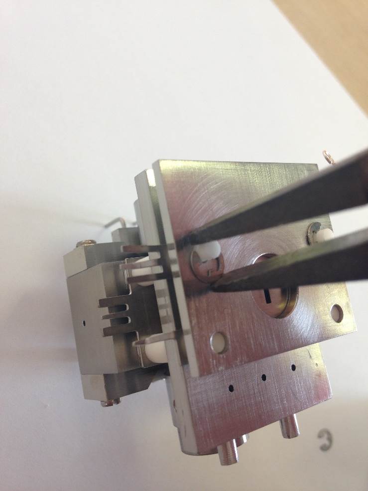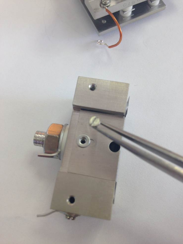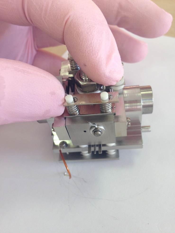 Push the filament down toward the source body and across to the left. It will then be pressed against the bottom positioning lug and also the left-hand lug. This will set the height in relation to the support bracket and the centrality of the filament wire to the ion block assembly.