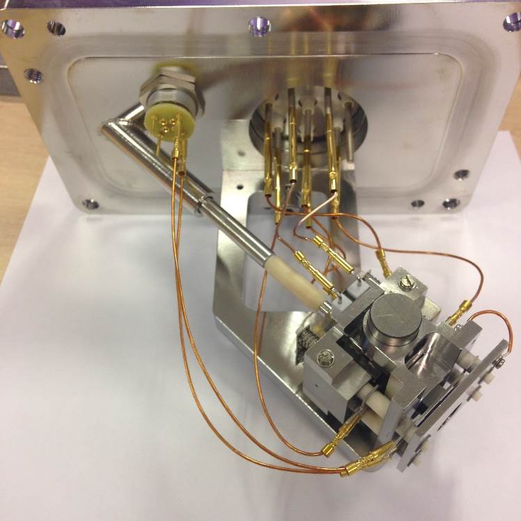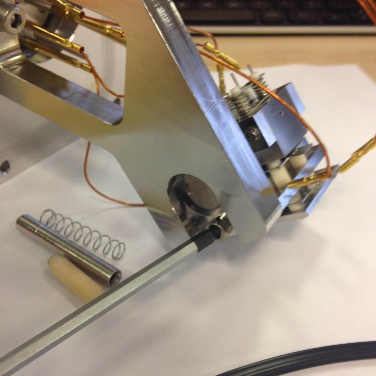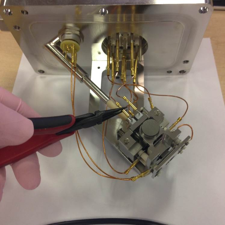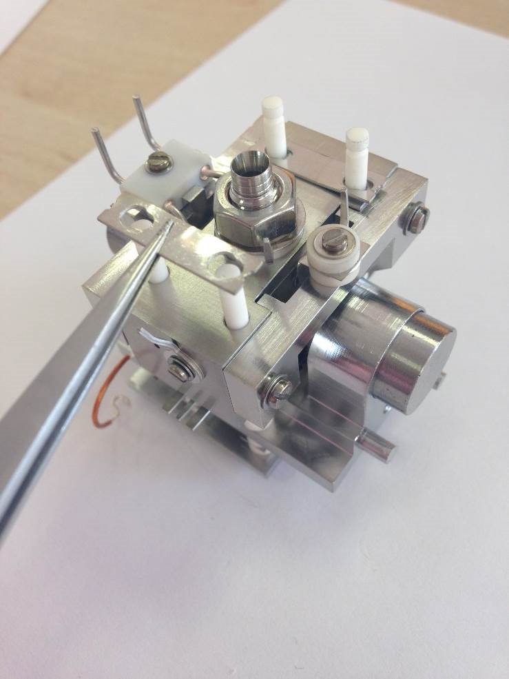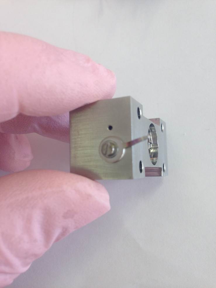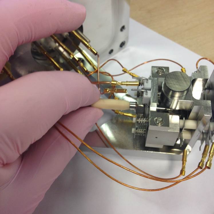 Push the filament down toward the source body and across to the left. It will then be pressed against the bottom positioning lug and also the left-hand lug. This will set the height in relation to the support bracket and the centrality of the filament wire to the ion block assembly.