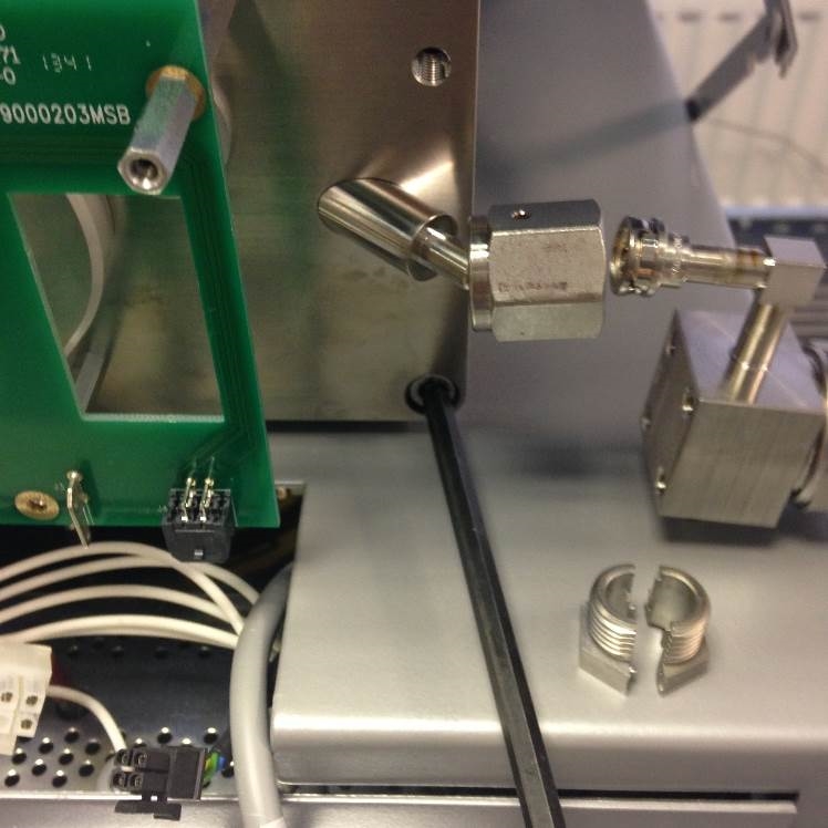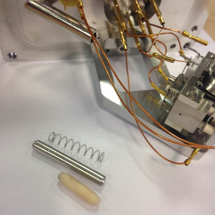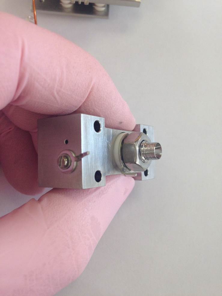 To remove the gas transfer pull the ceramic isolator away from the source. Keeping the spring compressed, move the ceramic away from the assembly. You will then be able to remove both the stainless steel pipe and the spring which sits within the fixed section.