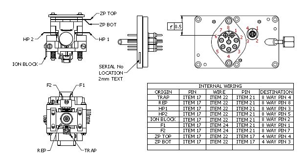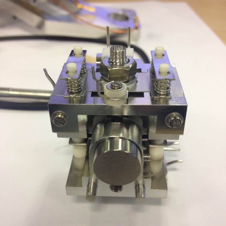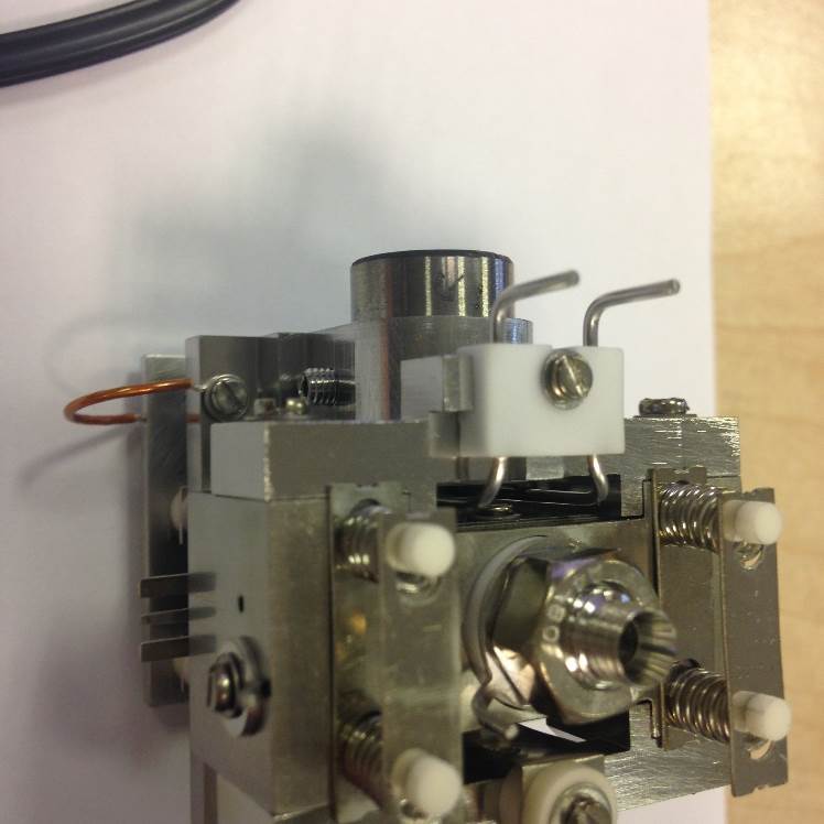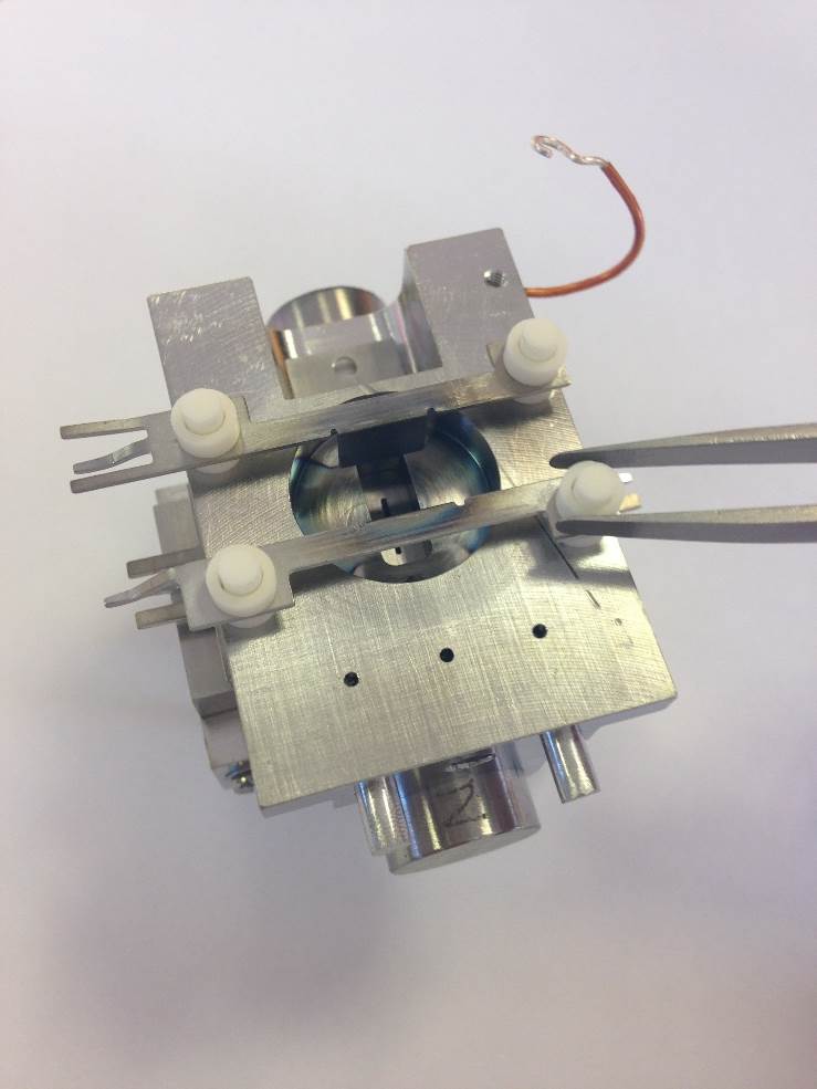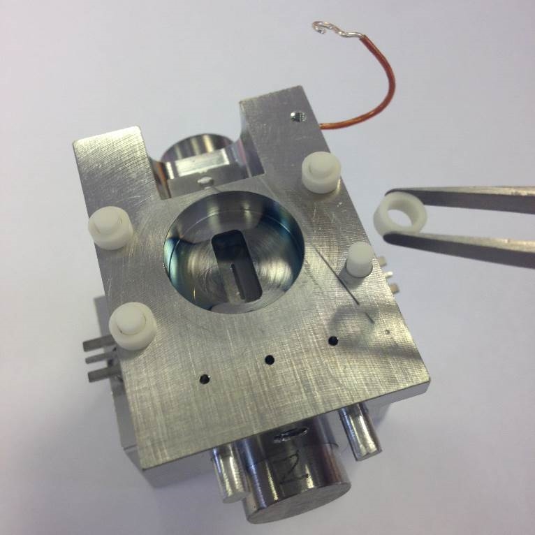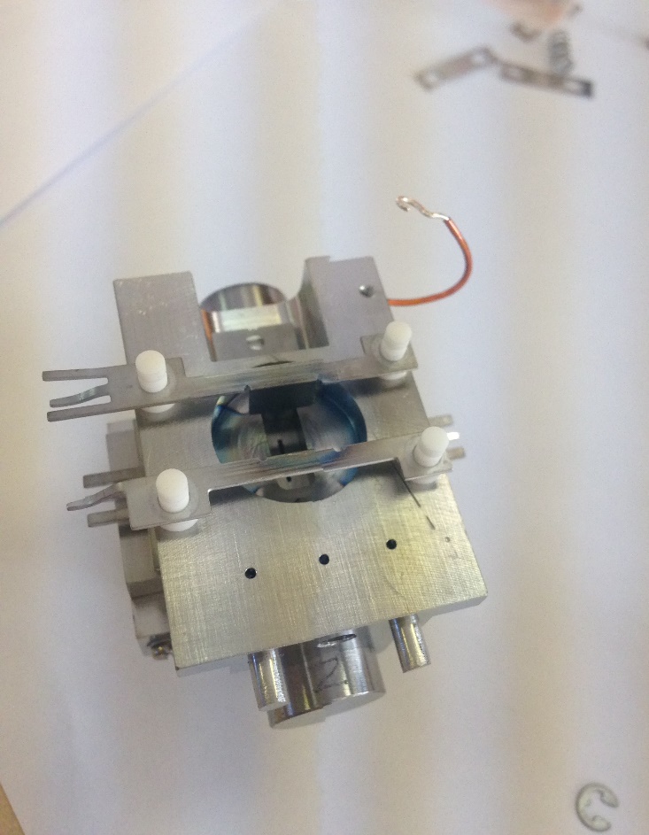 Fit the trap assembly on to the Trap Support. Another Spacer Ceramic is also fitted to the trap at the end where the electrons are incident. When correctly installed the ceramic will not fall off when facing downwards.