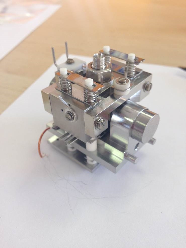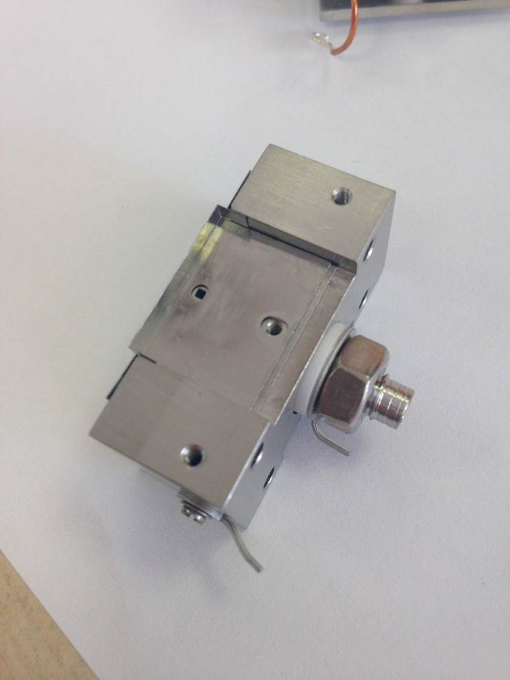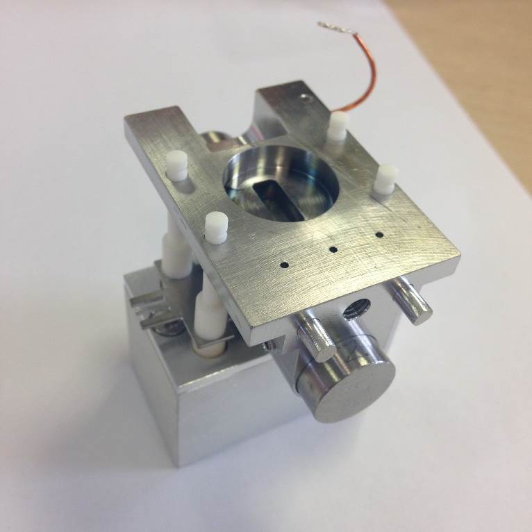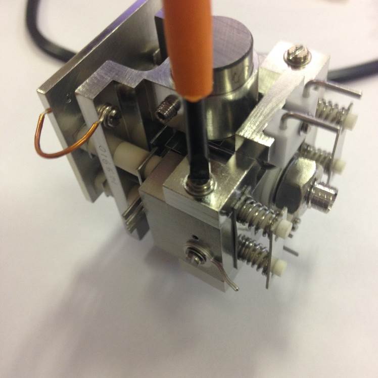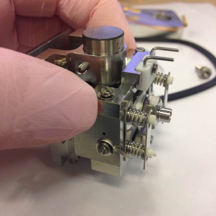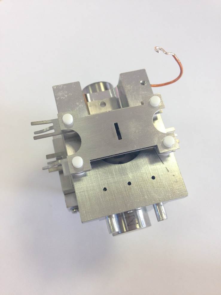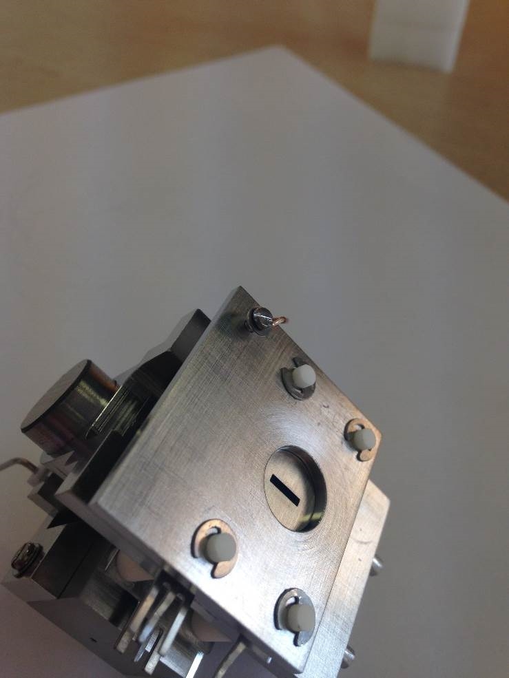 Fit the Electron Entry Plate using another M1.6 counter-sunk screw and washer. Check that the square hole on the ion exit plate is central to the circular one on electron entry plate.