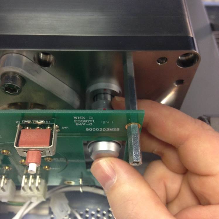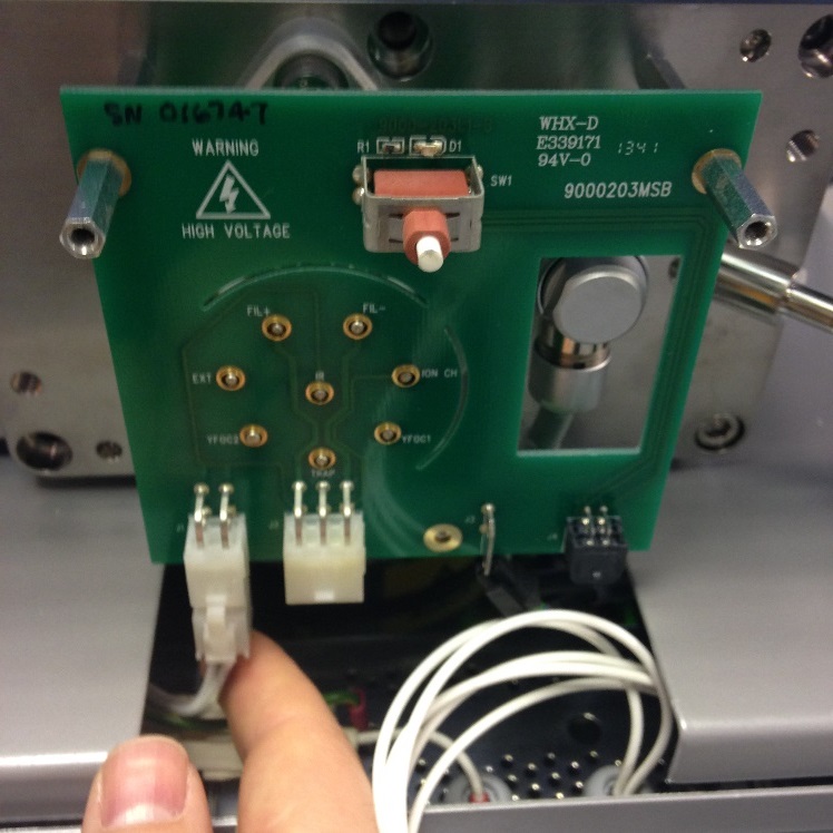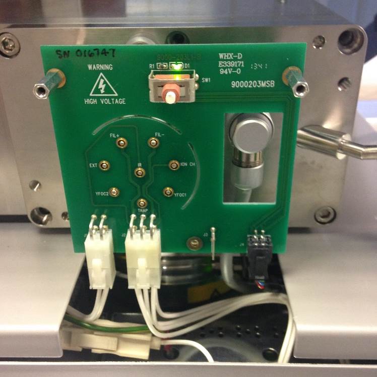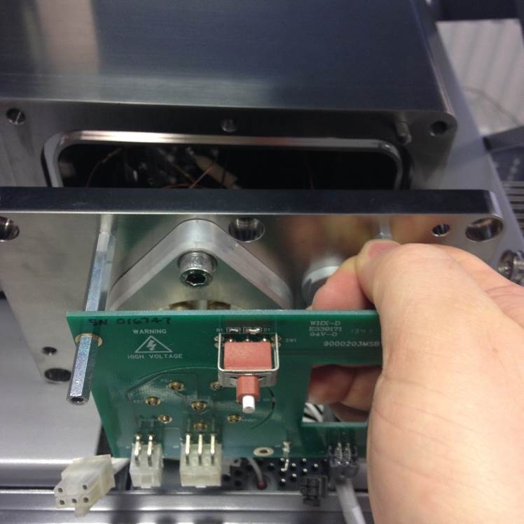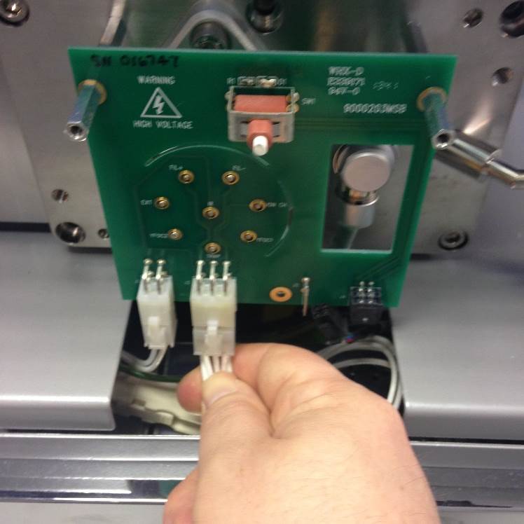 Once the cover is removed the Source Feedthrough PCB will be visible. The illuminated green LED status will show that the interlocks have been broken. The interlock connection is the 4-way black microfit and will have a 24V supply.