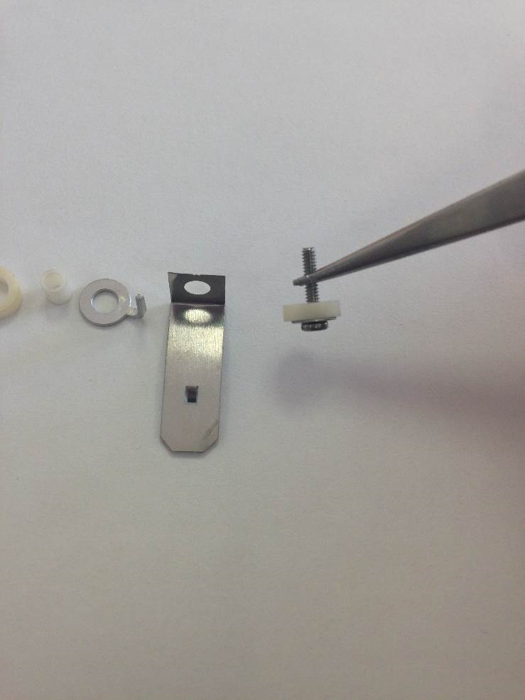 Take the M1.6 screw and and slide the M1.6, M2* and Ceramic Washer over. *M2 Washer not shown.