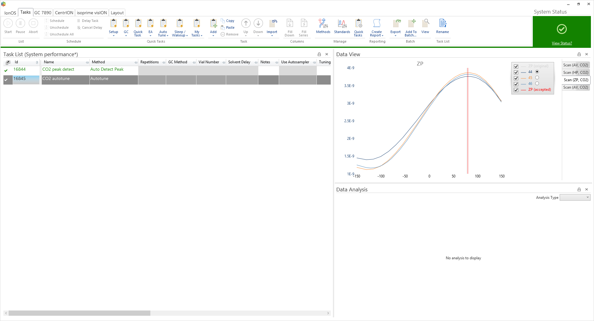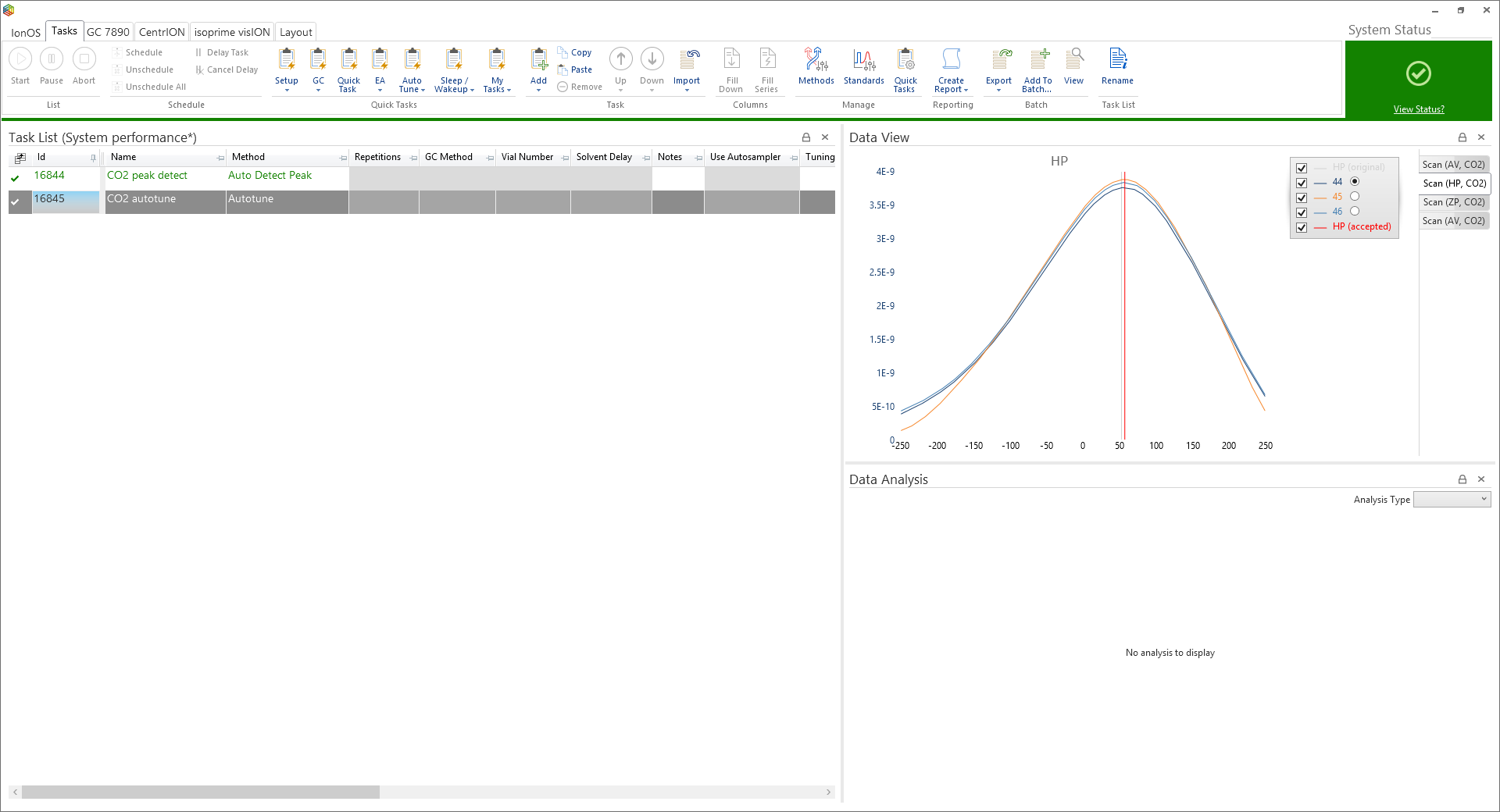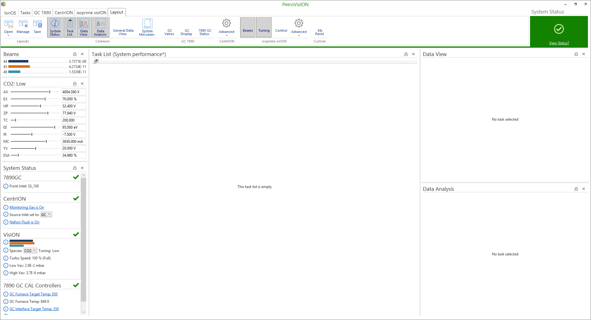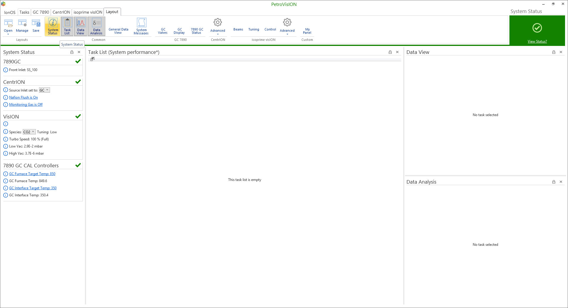 It is essential that the vacuum is at a level sufficient for analysis. With the inlet connected, the Nupro valve open and the source inlet valve (SIV) set to the appropriate inlet you can observe the measured vacuum by viewing the system status. This can be done by either clicking on the ‘view status’ link at the top right corner of the connected system page or by selecting ‘system status’ icon under the ‘layout’ tab (Figure 6-1). As standard the connected system page comprises of the task list, data view and data analysis windows and a ribbon bar on the top showing contextual content. This layout is fully configurable and can include more information by selecting an array of windows from the layout tab of the ribbon (Figure 6-2).