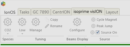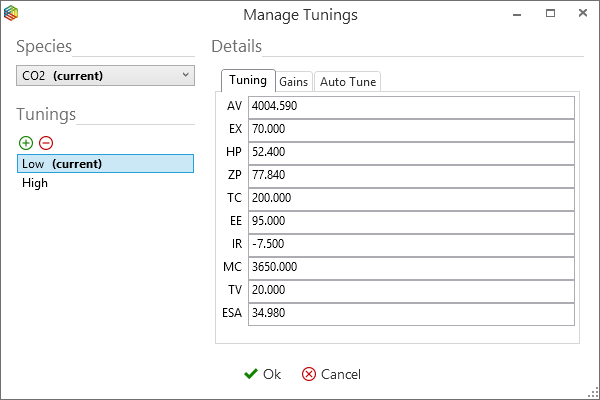 Under the isoprime precisION tab, select, for example CO2, from the dropdown list in the species section. From the tuning section you can then load a particular tune file, again from a dropdown list (Figure 6-3). By selecting the manage icon, the tuning parameters for each tune file can be observed and manually adjusted (Figure 6-4). Tuning parameters with recommended values are displayed within Table 6-1, however this is only coarse and fine tuning using the Autotune method is required before analysis.