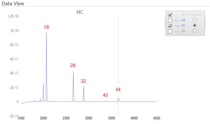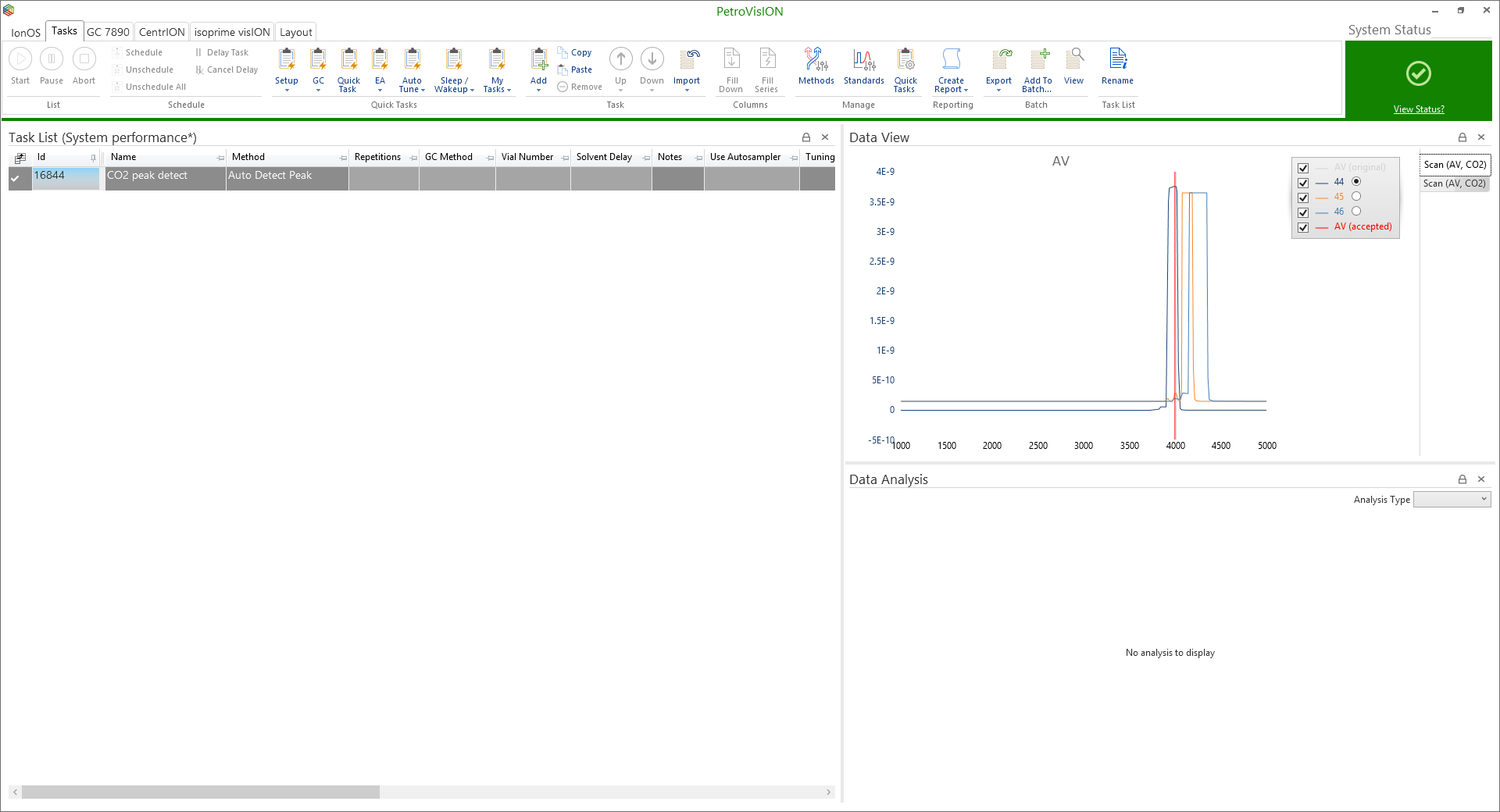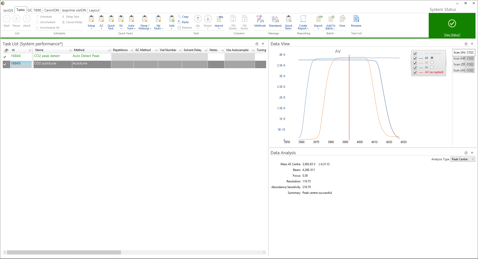 First add a new task to the task list (Tasks > Add) and then select Auto Detect Peak from the method dropdown and press start. This Auto Detect Peak method introduces a monitoring gas into the IRMS and then scans the accelerating voltage over a wide range of voltages until the ions are detected at the Faraday collectors. Figure 6-5 displays the Auto Detect Peak scan for the CO2 monitoring gas. The accelerating voltage is ramped between 1000 to 5000 V, while all other tuning parameters remain unchanged. The mass 44 beam is visible in the major collector at around 4000V, while the beams corresponding to masses 45 and 46 are evident in the Minor 1 and Minor 2 collectors at the same time.