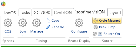After running the background scan method or altering the magnet current in any way, it is important that the magnet is cycled to remove hysteresis; this can be done by clicking the Cycle Magnet icon under the isoprime precisION tab (Figure 6-10). The cycle magnet procedure involves setting the acceleration voltage to zero, followed by setting the magnet current to maximum, then minimum and then back to its original setting and before finally restoring the acceleration voltage.