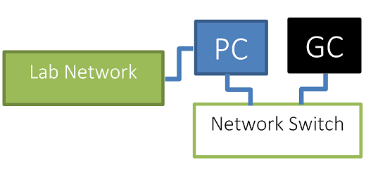 Figure 5-34: PC and GC connected to the same network switch and the network switch isolated from the laboratory network. The PC is also connected directly to the laboratory network. I.e. the PC has two network interfaces.