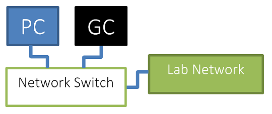 Note: it is not possible to connect to the GC to the PC directly. You must always use either the laboratory network or the switch provided.