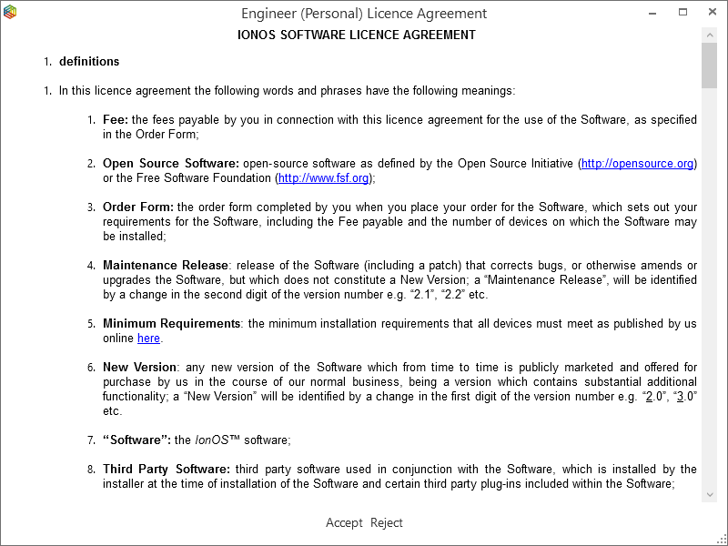 Once the SLA has been accepted, IonOS will attempt automatic activation of the license online. See License Activation for more details.