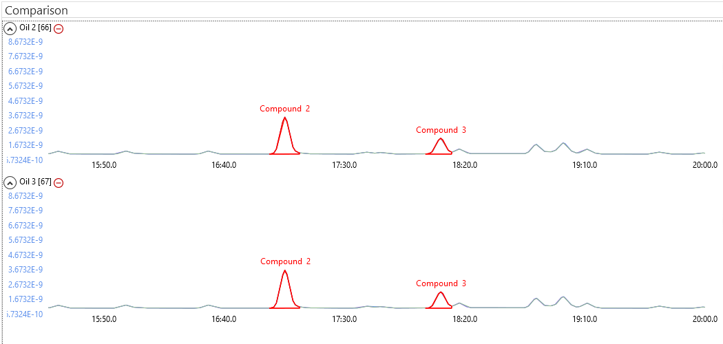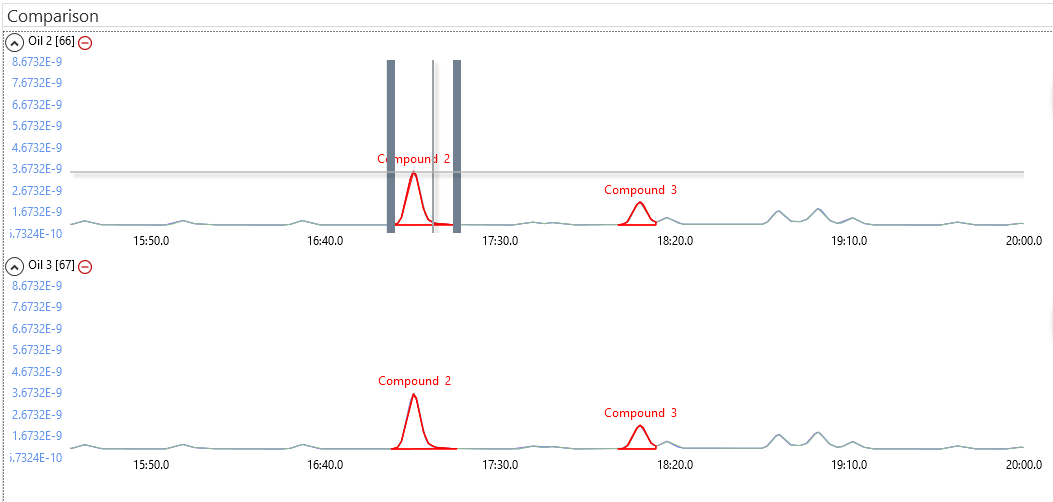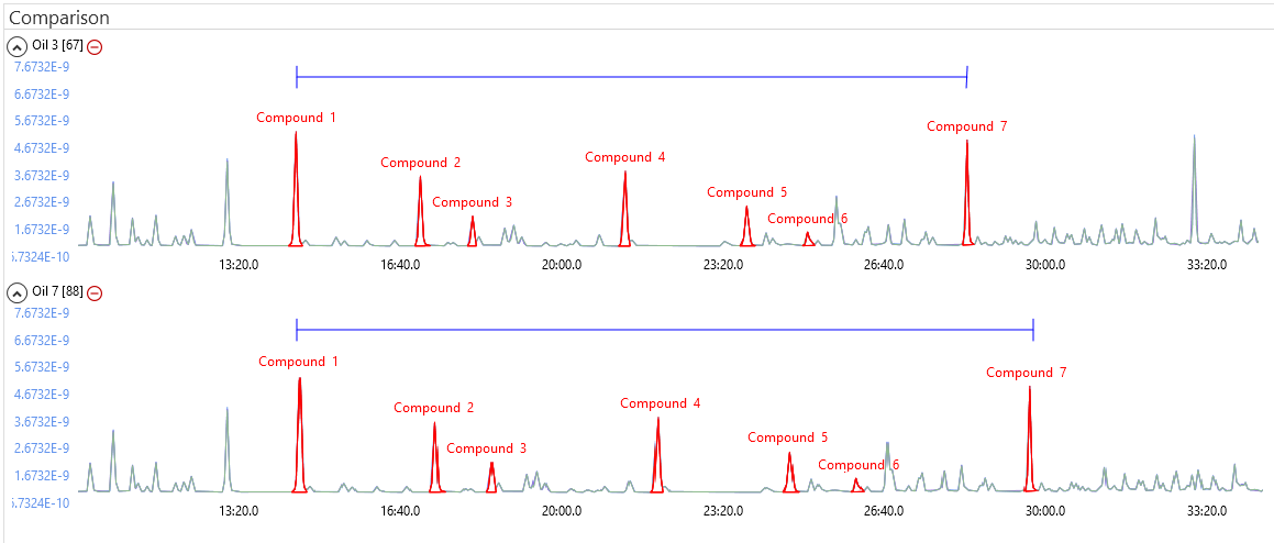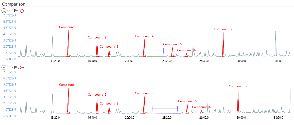 GC batch processing comparison view showing 2 injections with a retention time offset sharing the same Peak Map displays two injections that largely share the same compounds, however there is a shift in the retention times of the peaks after 23:20. In this example, A Peak Map was generated from the first chromatogram and both injections been associated with this Peak Map. The shift in the retention times was then easily corrected for by explicitly identifying Compounds 4 and 5 on the second chromatogram. The rest of the compounds after Compound 5 were then automatically identified because their retention times were shifted by the same offset (between Compounds 4 and 5).
